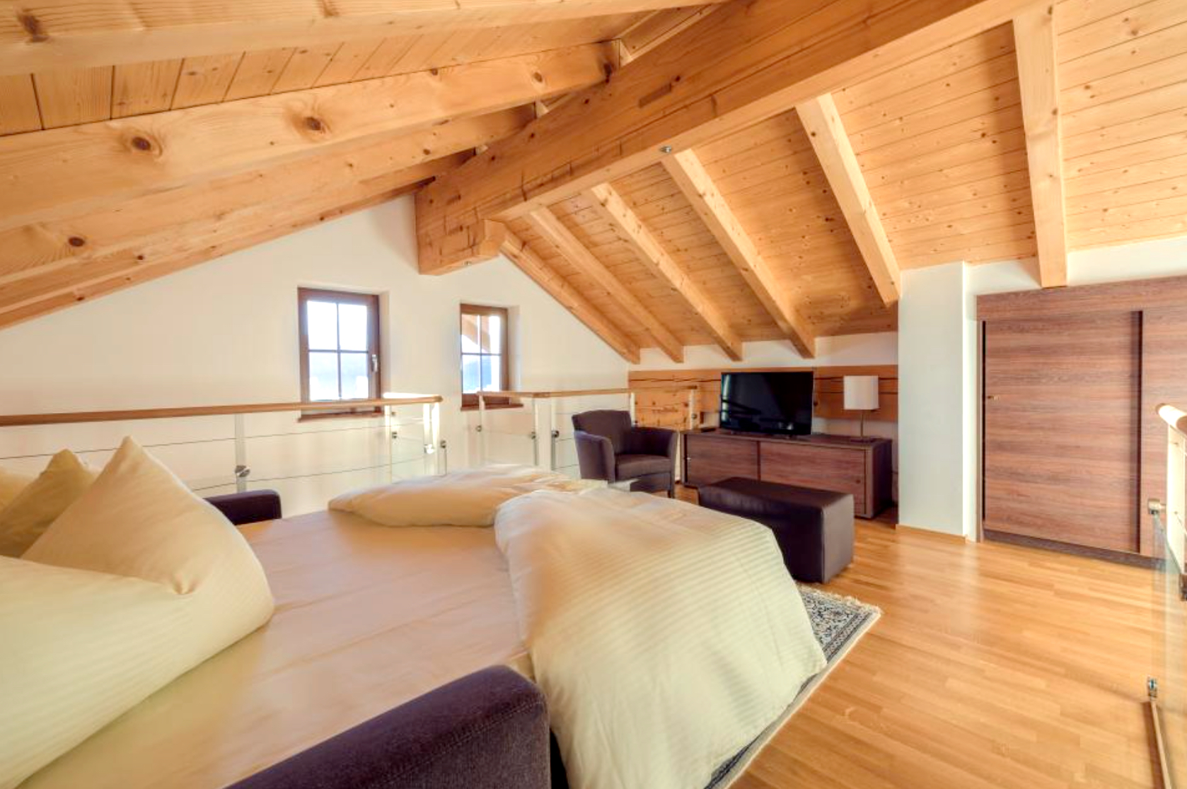 Jede einzelne Ferienwohnung bietet zwei Schlafzimmer, eine (Schlaf-)Couch für 2 Personen im Wohnzimmer, zwei Badezimmer, eine vollausgestattete Küche zur Selbstversorgung, und/oder eine Terrasse bzw. Balkon, darüber hinaus einen atemberaubenden Blick in das Enns- und Flachautal.